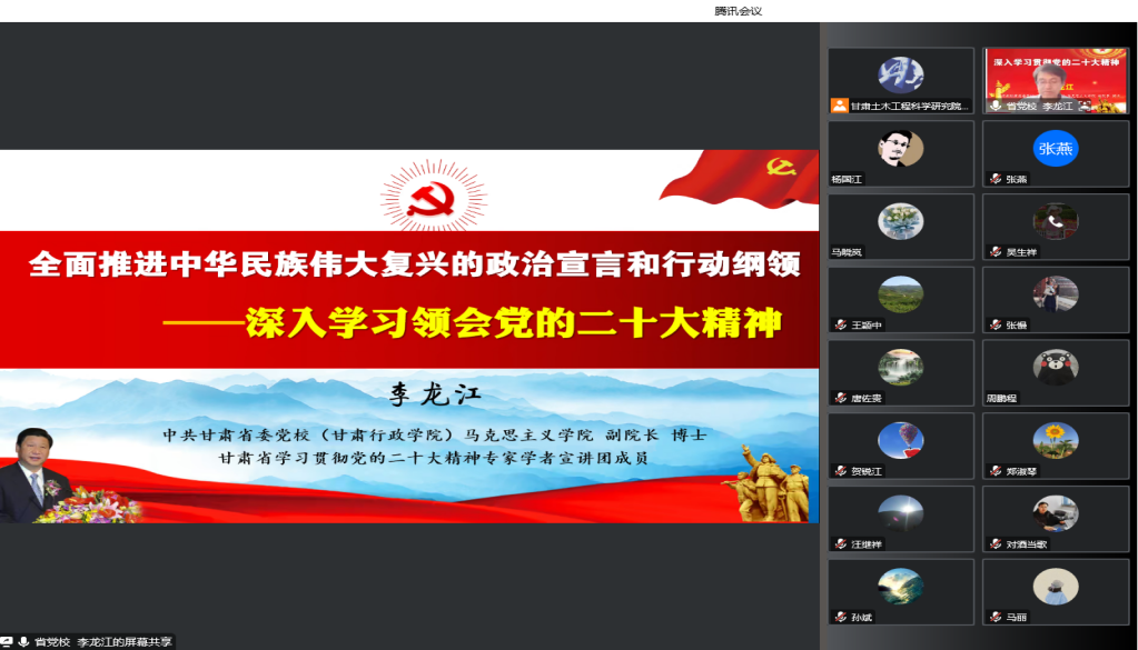 <p style="text-indent: 2em; text-align: left;"><span style="font-size: 18px;">12月14日，甘肃土木工程科学研究院有限公司以视频会议形式召开党委理论学习中心组学习（扩大）会议暨党的二十大精神专题培训辅导讲座。党委副书记、监事会主席、工会主席张磊主持会议，领导班子成员、全体党员、中层干部、入党积极分子参加。</span></p><p style="text-indent: 2em; text-align: left;"><span style="font-size: 18px;">会议邀请省委党校马克思主义学院副院长、全省学习贯彻党的二十大精神专家学者宣讲团成员李龙江教授作了题为《全面推进中华民族伟大复兴的政治宣言和行动纲领——深入学习领会党的二十大精神》的专题讲座。以党的二十大报告为主线，结合国有企业高质量发展具体事例，对党的二十大精神进行了全面深入、系统详尽的阐释解读，使全体党员干部职工从多方面、多角度对党的二十大精神的核心要义有了更为清晰和深刻的认识，对进一步全面学习、全面把握、全面落实党的二十大精神起到了积极指导作用。</span></p><p style="text-indent: 2em; text-align: left;"><span style="font-size: 18px;"></span></p><p style="text-align: center"><img src="../../hdupf/img/202212/20221215212445_202886.png"/></p><p></p><p style="text-indent: 2em; text-align: left;"><span style="font-size: 18px;">会议强调，学习宣传贯彻党的二十大精神，是当前和今后一个时期的首要政治任务，全体党员干部职工要进一步提升政治站位，凝聚思想共识，在学习领会上下功夫、在宣传宣讲上见行动、在贯彻落实上求实效，推动学习宣传贯彻党的二十大精神走深走实。一要坚持学深悟透，高站位强化政治担当。全体党员干部职工要切实将思想和行动统一到党的二十大精神上来，将智慧和力量凝聚到党的二十大确定的目标任务上来，全面把握党的二十大提出的重要思想、重要观点、重大战略和重大举措。二要强化学习宣贯，高标准实现全覆盖。土木工程院两级党组织要开展多形式、分层次的学习培训，把学习贯彻党的二十大精神纳入党员干部日常教育，加强讨论交流，增强思想碰撞，不断从党的二十大精神中汲取智慧和力量。三要强化统筹融合，高质量实现发展新提升。将学习宣传贯彻党的二十大精神转化为攻坚克难、推动工作的生动实践，以学促干、以干践行，扎实做好年度各项工作收官，深入贯彻落实全省工业复工复产稳增长调度会和集团公司复工复产稳增长调度会精神，科学谋划明年和今后一个时期工作，盘点重点工作，做好项目储备，加力奋进、冲刺攻坚，夯实生产经营基础，为土木工程院高质量发展保驾护航。</span></p><p style="text-indent: 2em; text-align: right;"><span style="font-size: 18px; color: rgb(165, 165, 165);">(责任编辑：田树芬)</span></p>                        </div>
