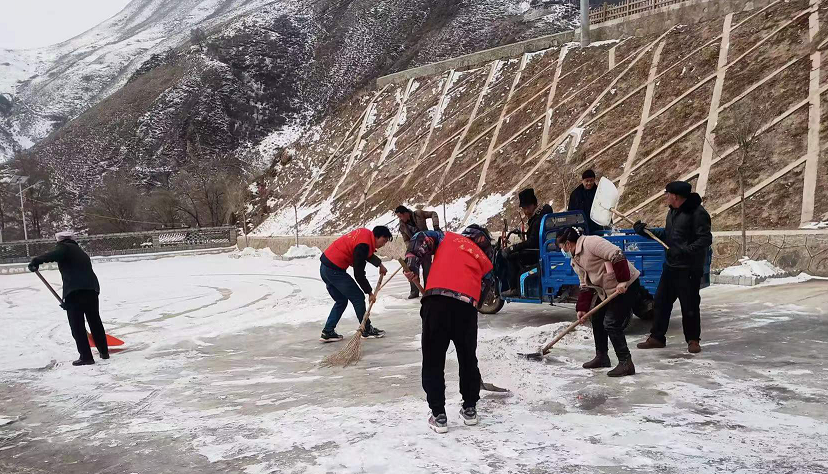 2月7日,农历大年初七,伴随着凛冽的寒风,卓尼县柳林镇东石沟村气温骤降,雪花纷纷扬扬地飘落,厚厚地积雪给人民群众的生活带来诸多不便。永利12311手机版驻村帮扶工作队在镇党委的统一部署下,不畏严寒,迅速投入到环境卫生整治、融化结冰路面和清扫积雪活动中。