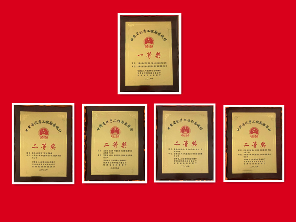 科研成果在工程实践中开花结果,多个项目获技术表彰奖励:《民勤县红崖山水库加高扩建工程》获甘肃省优秀工程勘察设计一等奖;《石羊河流域重点治理项目西营河专用输水渠工程》《古浪县生态移民暨扶贫开发黄花滩项目水利骨干工程》《大通河纳子峡水电站工程地质勘察》《昌马水库枢纽工程地质勘察》分别获甘肃省优秀工程勘察设计二等奖;《甘肃中部生态移民扶贫开发供水工程可行性研究报告》获全国优秀工程咨询成果奖三等奖;《清水县“十三五”第二批光伏扶贫电站项目》获全国优秀工程咨询成果奖优秀奖。