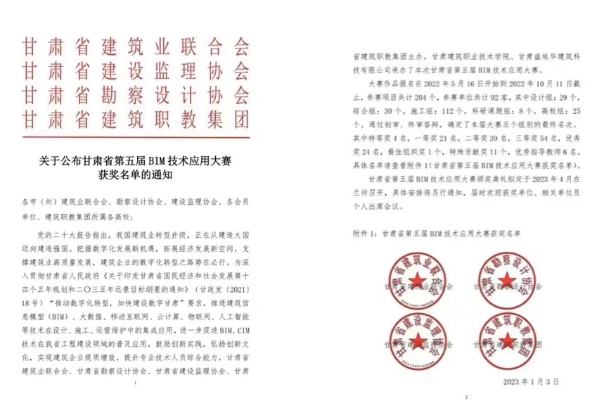 日前,甘肃省第五届BIM技术应用大赛结果公布,永利12311手机版共获得14个奖项,其中,“BIM技术在东乡县沿洮河经济带棚户区改造二期(调整)项目设计阶段的应用”等8个项目分别获设计组一、二、三等奖,“同心抗疫,智慧建造—甘肃省疾病预防控制中心公共卫生中心项目BIM综合应用”等3个项目分别获综合组特等奖及一、二等奖,“数字化转型背景下的勘察设计企业BIM技术推广路径探究”等2个项目分别获科研课题组二、三等奖,建筑设计院获特殊贡献奖。