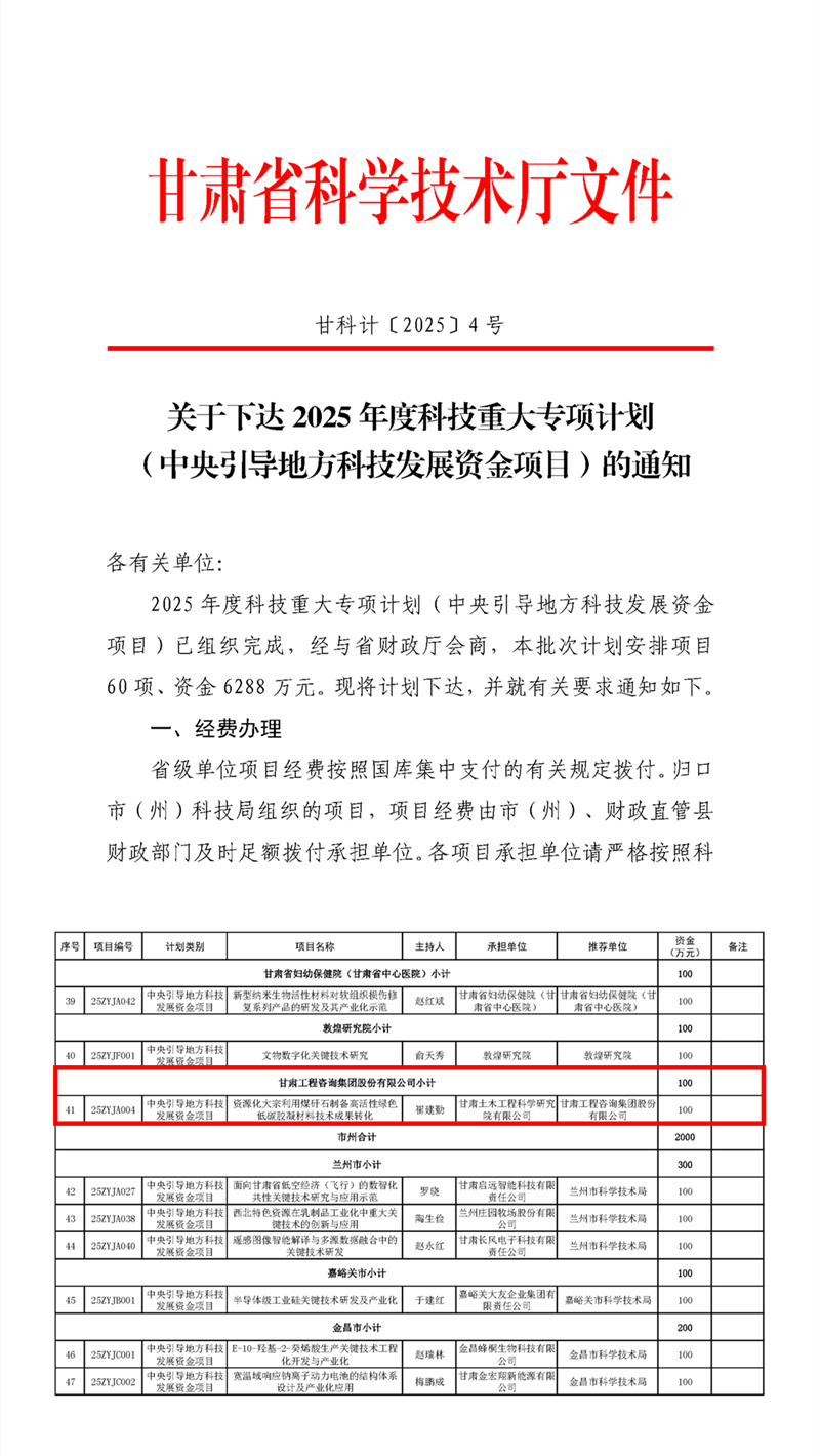 近日,甘肃省科技厅公布了2025年度科技重大专项计划(中央引导地方科技发展资金项目)立项名单,永利12311手机版土木工程院主持申报的“资源化大宗利用煤矸石制备高活性绿色低碳胶凝材料技术成果转化”项目成功立项。