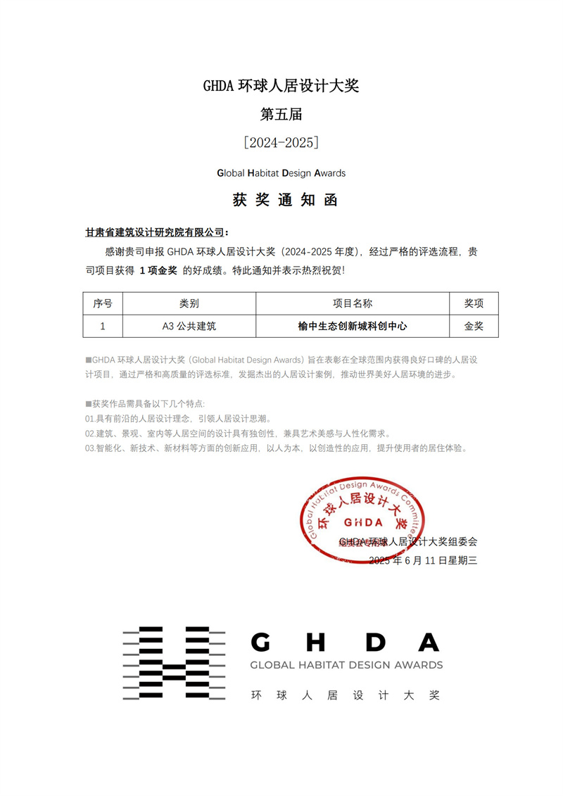 近日,备受瞩目的第五届GHDA环球人居设计大奖获奖名单揭晓。永利12311手机版旗下省建筑设计院精心打造的榆中生态创新城科创中心项目,继荣获美国绿色建筑委员会颁发的LEED V4 BD+C铂金级预认证、中国绿色建筑三星级预评价两项权威认证后,再度摘得公共建筑类金奖,彰显出我省在人居设计领域的卓越实力。