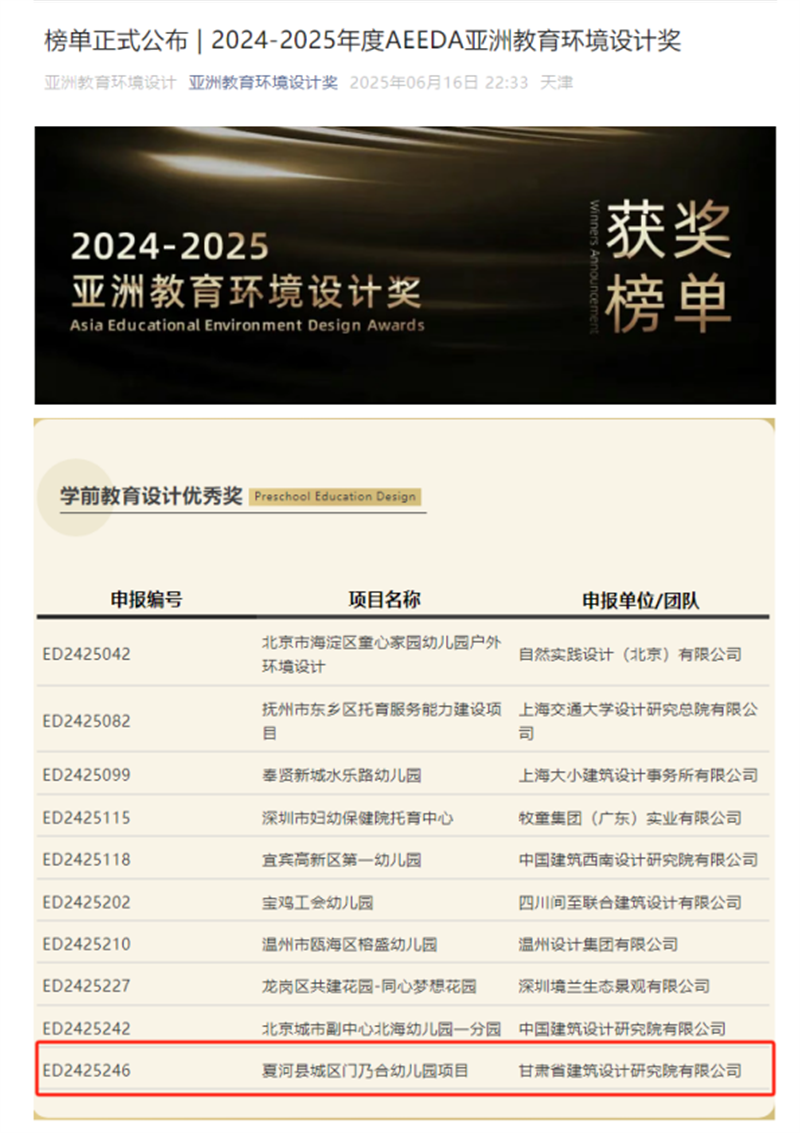 <p style="text-indent: 2em;"><span style="font-size: 18px;">近日，备受瞩目的2024-2025年度AEEDA亚洲教育环境设计奖（Asia Educational Environment Design Awards）获奖名单正式揭晓。由甘肃工程咨询集团旗下省建筑设计院设计的夏河县城区门乃合幼儿园项目，从百余件参赛作品中脱颖而出，荣膺学前教育设计领域优秀奖，为甘肃建筑设计行业赢得了国际声誉。</span></p><p style="text-align: center; text-indent: 0em;"><img src="../../hdupf/img/202506/202506191750332150242441.png"/></p><p style="text-indent: 2em;"><span style="font-size: 18px;">AEEDA亚洲教育环境设计奖是亚洲唯一专注于教育环境设计的权威奖项，面向亚洲广泛征集涵盖学前教育、基础教育、职业及高等教育领域的优秀校园建筑作品。本届大赛吸引了海内外众多设计机构参与。评审团阵容强大，汇聚了来自中国大陆、港澳台地区，以及日本、新加坡、美国等地的知名权威专家。经过近8个月的项目征集、初评、终评及复审，最终遴选出获奖名单。</span></p><p style="text-indent: 2em;"><span style="font-size: 18px;">夏河县门乃合幼儿园坐落于甘南藏族自治州夏河县核心区域，南临大夏河，总建筑面积9710平方米。项目由甘肃省工程勘察设计大师、甘肃工程咨询集团总工程师冯志涛领衔，带领建筑创作中心青年骨干设计师组成项目团队，历时三年精心打造而成。</span></p><p style="text-align: center; text-indent: 0em;"><img src="../../hdupf/img/202506/202506191750332162715016.png"/></p><p style="text-indent: 2em;"><span style="font-size: 18px;">设计团队秉承“文化根系·生态课堂”的核心理念，实现了三大创新突破：文化传承创新，巧妙解构传统藏式建筑语汇，以象征性的“煨桑台”形态塑造入口空间，并运用夯土墙、木质格栅等本土材料与工艺，唤醒地域文化记忆。生态教育融合，充分利用场地自然高差，构建多层级生态活动圈。设置屋顶农场、戏水溪谷、观星台等多元互动空间，铺设出一条“从土壤到星空”的自然认知与探索路径。儿童友好设计，深度契合3-6岁儿童行为特征，引入模块化家具系统，并融入光影剧场、交互艺术墙等智慧化设施，充分激发幼儿的好奇心、探索精神与创造力。</span></p><p style="text-align: center; text-indent: 0em;"><img src="../../hdupf/img/202506/202506191750332170638161.png"/></p><p style="text-align: center; text-indent: 0em;"><img src="../../hdupf/img/202506/202506191750332178134745.png"/></p><p style="text-indent: 2em;"><span style="font-size: 18px; text-indent: 2em;">该幼儿园自2021年建成投入使用以来，已成为甘南地区学前教育的新标杆。其“让建筑本身成为活态教材”的设计理念，为高海拔民族地区的教育空间建设提供了极具价值的创新实践范本。</span></p><p style="text-align: right;">（责任编辑：朱珂宁）</p>                        </div>