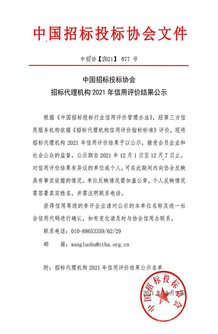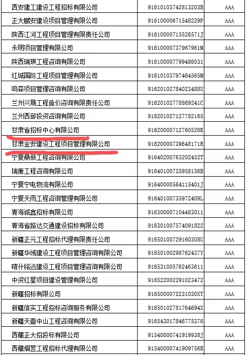近日,在中国招标投标协会牵头组织的2021年招标代理机构级信用评价认证工作中,经中招协委托的第三方信用服务机构(国资委)商业信用中心及有关行业专家评审,招标咨询集团子公司甘肃省招标中心有限公司和甘肃金安建设工程项目管理有限公司获得2021年招标代理机构AAA级信用评价最高等级认证。