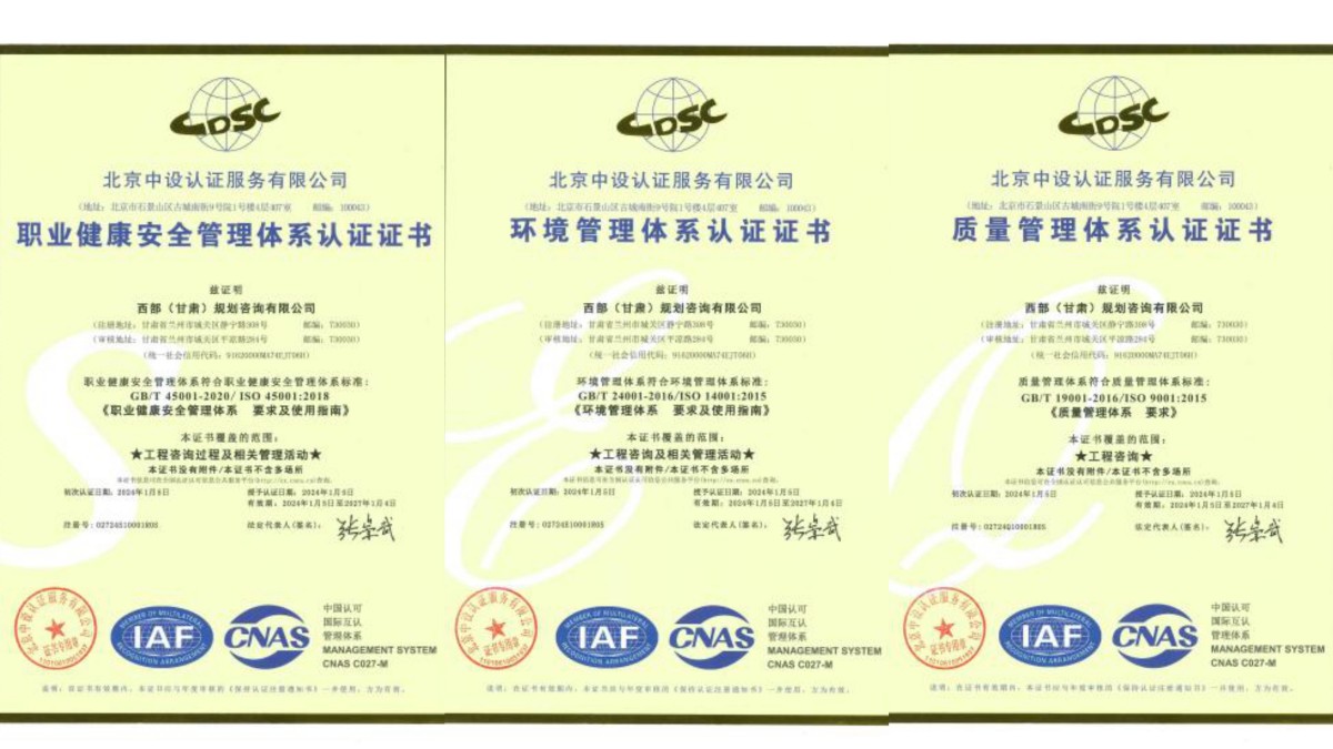 近日,经北京中设认证服务有限公司评审,西部(甘肃)规划咨询有限公司顺利通过ISO9001质量管理体系、ISO14001环境管理体系、ISO45001职业健康安全管理体系认证并取得证书。