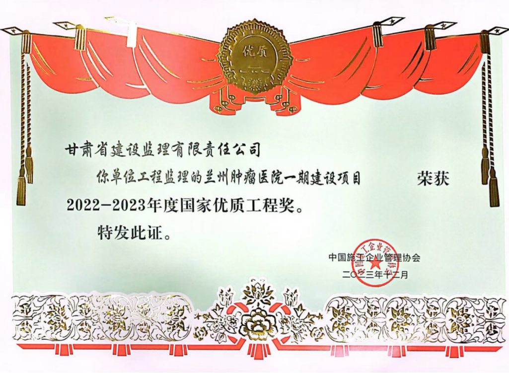 近日,经中国施工企业管理协会评审,省建设监理公司监理的兰州肿瘤医院一期建设项目荣获2022-2023年度国家优质工程奖。此前,该项目已先后荣获甘肃省建设工程文明工地、2021-2022年度甘肃省建设工程飞天奖、2022-2023年度国家优质工程奖。
