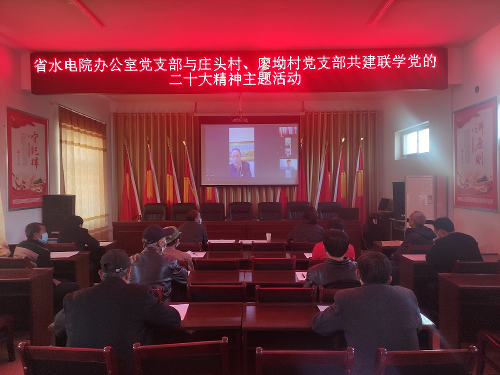 为持续促进党的二十大精神学习贯彻走深走实,使党的二十大精神进村入户、深入人心,11月22日,甘肃省水利水电勘测设计研究院有限责任公司办公室党支部与帮扶村西峰区庄头村党支部、廖坳村党支部开展共建联学党的二十大精神主题活动。