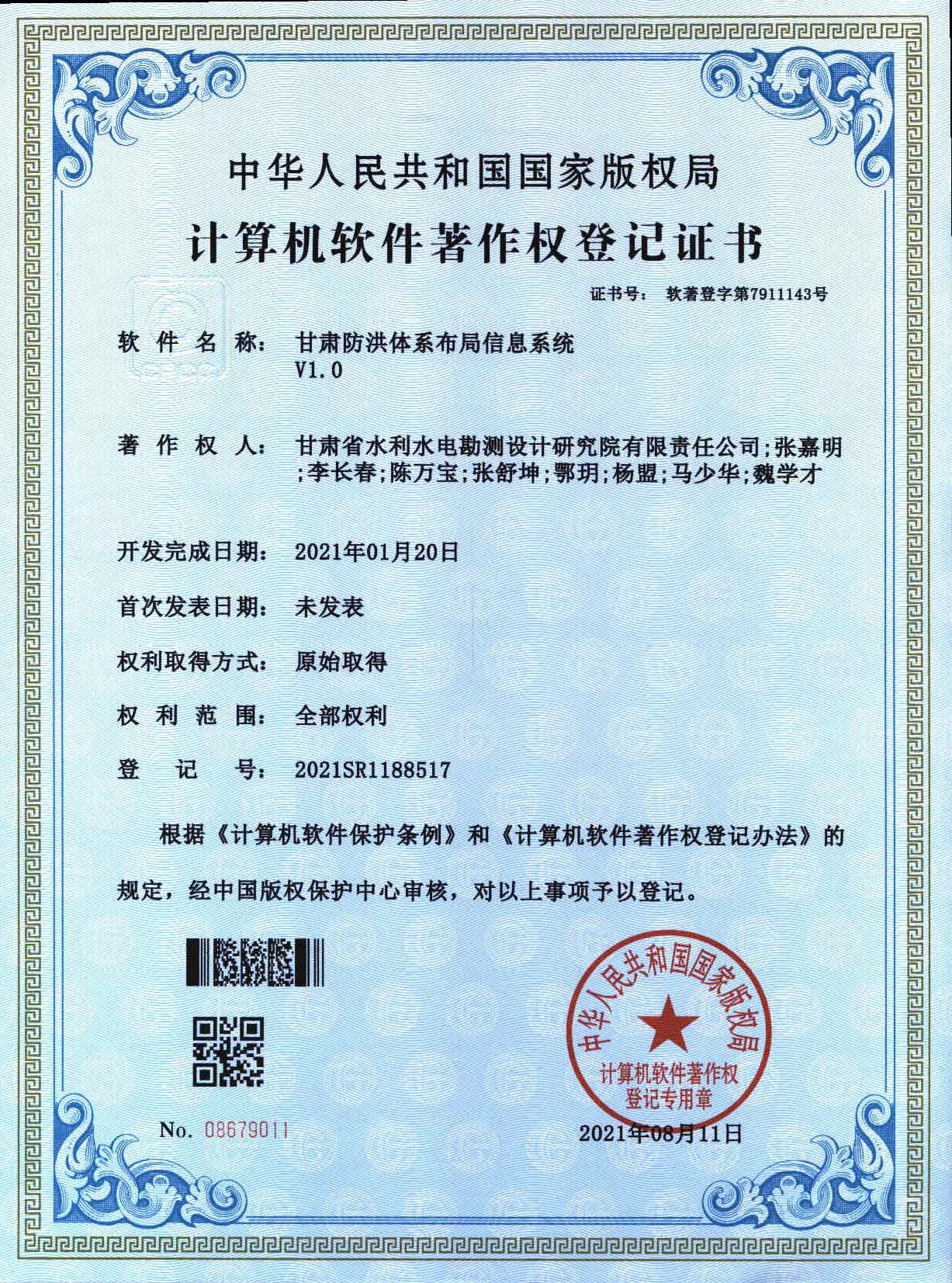 软著登记证书——甘肃防洪体系布局信息系统
